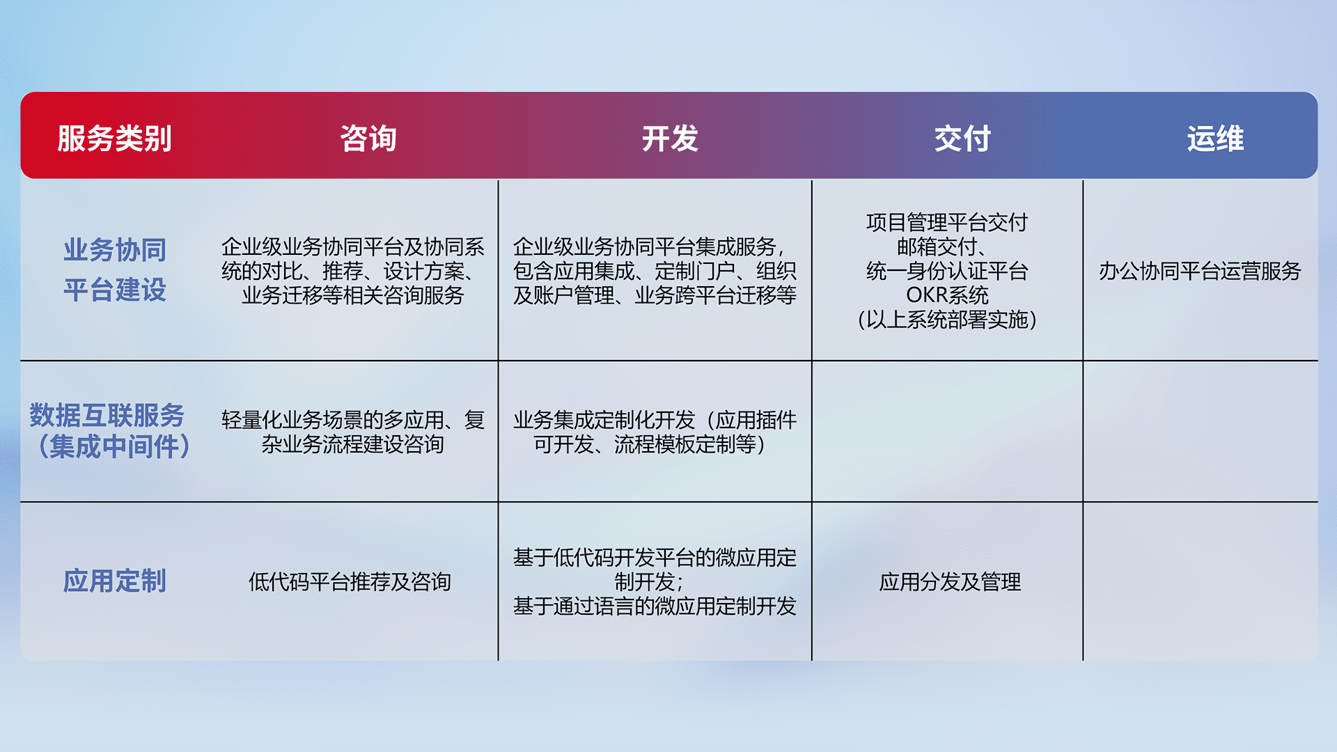 针对钉钉、、企微、、、、IDaas等平台级产品提供产品的规划、、方案、、交付、、、定制化开发等服务,,,实现如统一协同办公、、、智能客户服务、、、混合会议管理、、、、智能数据查询、、、等业务场景,,,,实现数字化转型。。。